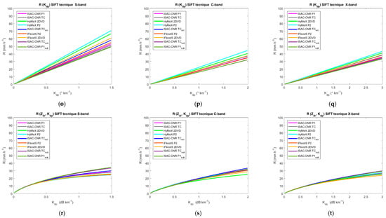 Representation of the weather radar algorithms obtained using different datasets of measured DSD and following the SIFT approach. (a–c) are ah(Kdp) relations for S-, C-, and X-band, respectively; (d–f) are ad(Kdp) relations for S-, C- and X-band, respectively; (g–i) are R(Zh) relations for S-, C-, and X-band, respectively; (l–n) are R(Zh,Zdr) relations for S-, C-, and X-band, respectively; (o–q) are R(Kdp) relations for S-, C-, and X-band, respectively; and (r–t) are R(Zdr,Kdp) relations for S-, C-, and X-band, respectively.