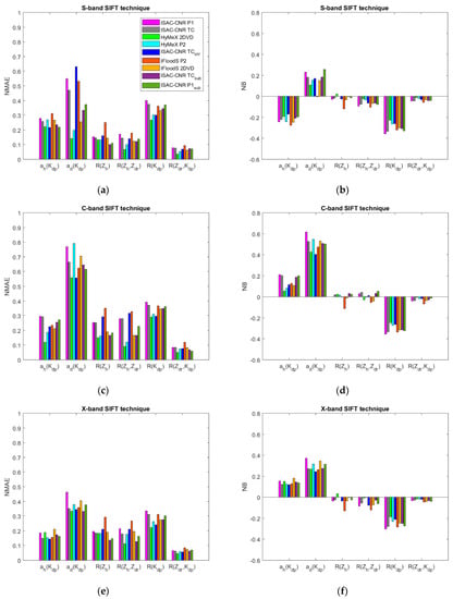 For the different estimators considered in this study, (a,c e) represent the values of NMAE, and (b,d,f) those of NB at S-, C- and X-band following the SIFT approach.