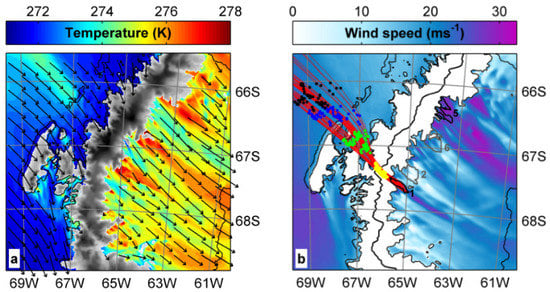 The Antarctic Peninsula presents a long high barrier to the prevailing atmospheric flow, with little to disturb this flow upwind (usually to the west) and a flat homogeneous ice shelf downwind (the Larsen C Ice Shelf), allowing foehn features to be clearly distinguished [18]. Aircraft-based observations have been used to investigate foehn characteristics and dynamics using a case study approach, and to validate NWP simulations [18,19]. In the cases investigated, foehn signatures in the wind, temperature and humidity fields are seen to persist for hundreds of kilometres downwind of the mountains. Figure 1 illustrates one such case; the north-westerly passage of air across and downwind of the Peninsula conveyed in wind vectors and back trajectories, and strong leeside foehn warming evident in a cross-Peninsula temperature gradient of up to 7 K. Note that ‘foehn jets’ are apparent on the ice shelf; these are a result of gap flow acceleration through mountain passes on the Antarctic Peninsula’s crest [18,20].
