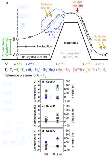 Foehn heating contributions. Panel (a) illustrates the Lagrangian heat-budget model for air passing over a mountain and experiencing the following foehn warming mechanisms: Isentropic drawdown (ΔIDT), latent heating and precipitation (ΔLHT), sensible heating due to mechanical mixing (ΔSHT), and radiative heating (ΔRHT), as well as a pressure-gradient related cooling (ΔΔPT). These contributions sum to a total foehn heating (ΔFT). Panels (b–d) show the foehn heating contributions as a change in temperature (K). The total foehn warming is plotted as a large open circle and the heating contributions are colour coded: Isentropic drawdown (green), latent heating (blue), sensible heating through mixing (red), and pressure-gradient cooling (grey). In these cases, the radiative heating contribution is negligible. Also shown is the cross-mountain descent (+). Six heat-budgets are illustrated, for three cases of foehn in Whirlwind Inlet (WI) and a region north of Whirlwind Inlet (N of WI)—see Figure 1 for locations. (Adapted from Reference [9]).