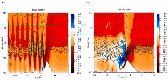 Vertical cross-sections of cross-ridge wind and potential temperature through two idealised 3-D simulations of northerly flow over East Falkland in (a) “Type 1” and (b) “Type 2” rotor flows. The wind component is shaded (units are m s−1) and potential temperature contoured every 1 K. Flow is from the right. Reproduced from Reference [53].