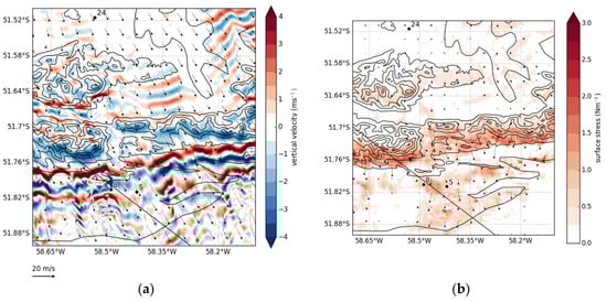Figure 4a depicts vertical velocities at 500 m altitude in a nested UM simulation of a case (described in Reference [39]) of large amplitude lee waves observed over East Falkland on 9 February 2001. Figure 4b shows surface stress in the innermost nest (grid spacing 100 m). The images are zoomed over the measurement array described in Reference [39], and highlight the complexity of the flow in three dimensions, with a high degree of variability across-flow and the near absence of quasi-2-D structure. Nevertheless, the wave motion aloft is mirrored in the pattern of surface stress, which in turn reflects areas of acceleration and deceleration/reversal in the 10 m winds, as for the 2-D case.