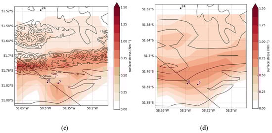 A comparison of Figure 4d with Figure 4b highlights the difference in peak stress (or equivalently, u*) values. This is important for the parametrised diagnosis of gusts; a parametrisation designed as a “boost” to the mean wind in coarse models based on a Monin-Obukhov approach will egregiously overplay gusts at very high resolution where in any case gusts already begin to be resolved [65].