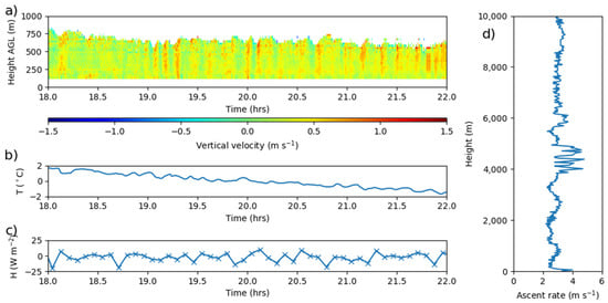 Observations of vertical velocity from lidar (a), 1.2 m temperature at 1 min intervals (b), 5-min average sensible heat flux at 50 m (c) and ascent rate from a radiosonde launch at 20:00 (d). All from 10 December 2009, during Intensive Observation Period (IOP) 10 of the COLPEX field experiment.