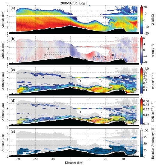 Radar data and derived turbulence parameters along a cross-mountain leg on 26 January 2006 at ~5200 m above sea level (ASL) in a flight across Medicine Bow Mountains (Wyoming, USA). (a) Radar reflectivity Z, (b) vertical Doppler velocity w, (c) variance of vertical velocity σw2, (d) eddy dissipation rate estimated using vertical velocity, EDRw, and (e) relative uncertainty of the estimate. The black contour in (c–e) marks the region, in which the relative uncertainty of the σw2 estimate is lower than 25%. Arrows in (c,d) indicate local maxima in σw2 and EDR.