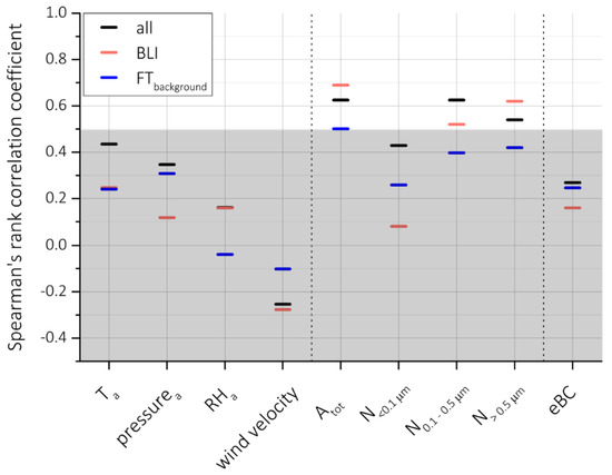 Spearman’s rank correlation coefficient for ice nucleating particle (INP) concentrations (at T = 242 K and RHw = 104%) with meteorological and size inferred parameters and eBC for all conditions, BLI, and FTbackground, for the total of the field campaigns. Low correlation coefficients (<0.5) are covered by grey shading. The 95% confidence intervals are within a maximum ± 0.003 of the respective Spearman’s rank correlation coefficients, but are not visible on the presented scale.