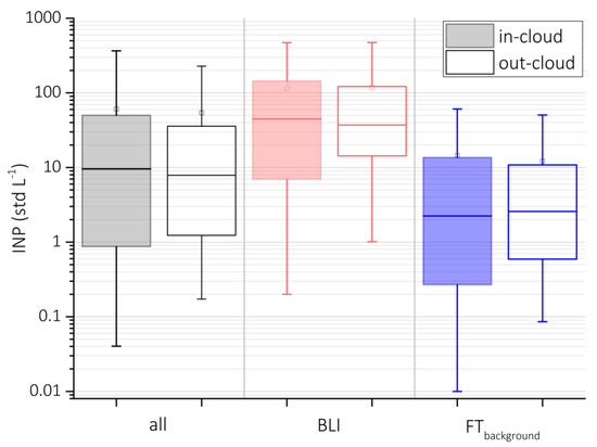 INP concentrations (242 K and RHw = 104%) distinguished into in- and out-of-cloud for all conditions, BLI, and FTbackground.