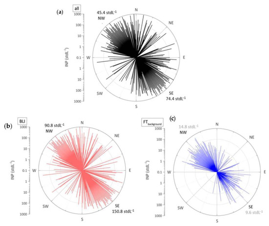 Another interesting finding is that there is no significant difference in INP concentrations as a function of wind direction during FTbackground (Figure 3), which indicates that INP in the FT cannot be attributed to a specific source. This is not surprising given that air masses in such an environment are considered to be well mixed due to the longer time scales of mixing and transport into the FT [26], possibly leading to a homogeneous INP population.