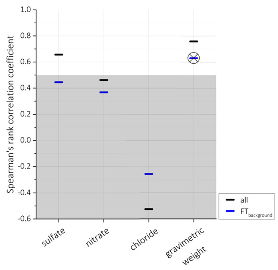 Spearman’s rank correlation coefficient for INP concentrations with sulfate, nitrate, chlorite, and the gravimetrically determined PM10, for all and FTbackground conditions; PM10 filter measurements refer to 24 h sampling time, respective INP concentrations are referring to >9 h of this sampling time interval. Low correlation coefficients (<0.5) are covered by grey shading; crossed mark refers to insignificant correlation.