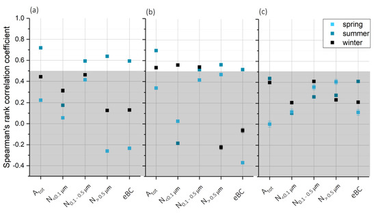 Spearman’s rank correlation coefficient for INP concentrations with meteorological and size inferred parameters and eBC for all conditions, BLI, and FTbackground for the seasonal measurements; (a) refers to measurements under all conditions; (b) to BLI; (c) to FTbackground. The 95% confidence intervals are within a maximum ±0.03 of the respective Spearman’s rank correlation coefficients as presented by the respective error bars.