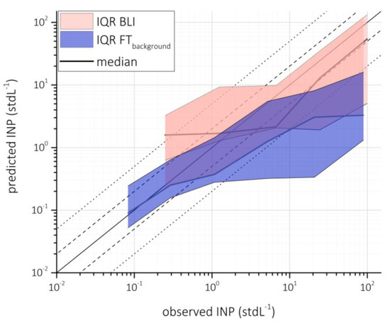 Predicted INP concentrations (D10) during FTbackground (blue) and BLI (light red) at T = 242 K and RHw = 104% as a function of observed INP concentrations; thick line give median INP concentrations, the filled area represents the inter-quartile range (25th to 75th quartile); the solid line represents the 1:1 fit, the long dashed lines represent a factor of 2, and the short dashed lines a factor of 5.