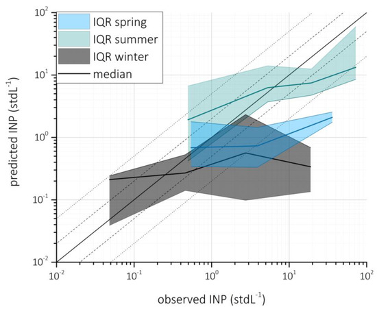 Predicted INP concentrations (D10) during FTbackground at T = 242 K and RHw = 104% as a function of observed INP concentrations in the season of spring (blue), summer (green), and winter (grey); thick line give median INP concentrations, the filled area represents the inter-quartile range; the solid line represents the 1:1 fit, the long dashed lines represent a factor of 2, and the short dashed lines a factor of 5.