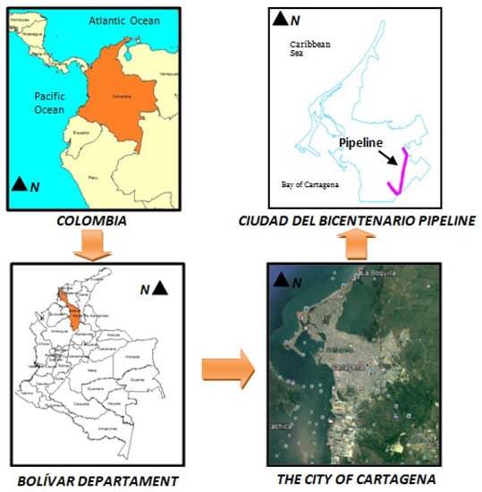 The Ciudad del Bicentenario pipeline is located in the southern of the city of Cartagena, Bolívar Department, Colombia (see Figure 2). The company Aguas de Cartagena (Cartagena, Colombia) provided the entire information regarding the pipeline [].