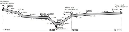 Figure 3 shows the scheme of the analyzed pipeline, which is located between chainages from m to m. It is configured as a Glass-Reinforced Plastic (GRP) pipeline with nominal diameter of 1000 mm, 580 m long, pressure class of 10, and stiffness class of 5000 []. Slope branches vary in a range from to . The system presents the emptying column No. 1 (chainages from m to m), and the emptying column No. 2 (chainages from m to m).