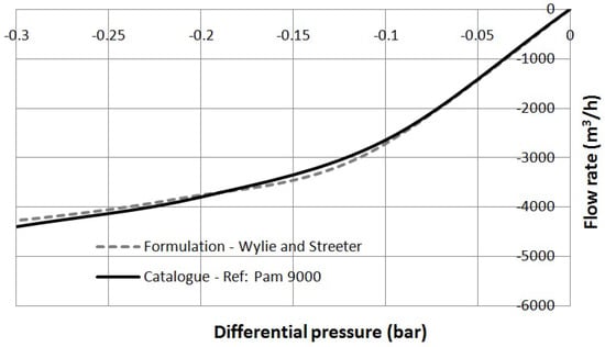 Three air valves were installed along the pipeline with nominal diameter of 100 mm (Type 9000-Pam manufacurer). They are located at chainages m, m, and m (see Figure 3). Air valves should work in subsonic flow ( bar < < 0) during the emptying process [,]. Using the formulation presented by Wylie and Streeter [], the inflow discharge coefficient () was calibrated with a value of to get similar values to the data provided by the Pam manufacturer (Derbyshire, UK) [] as shown in Figure 4.