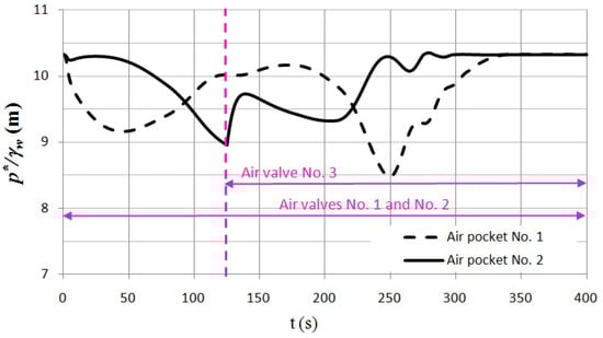 The resolution of this set of differential-algebraic equations (Equations (1)–(11)) was conducted using Matlab (The MathWorks, Inc., Natick, MA, USA). In order to simulate the most critical situations, small air pocket sizes were considered. However, to avoid a numerical problem, a minimum air pocket length of 1 mm was established in water columns 1 and 2 []. A friction factor of was used considering an absolute roughness of mm and a polytropic coefficient (k) of .