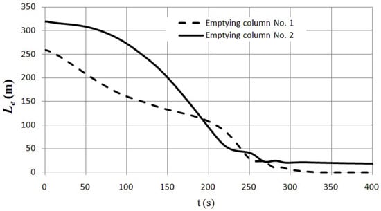 Transient phenomenon shows how the lengths of the emptying columns 1 and 2 are drained during the entire hydraulic event, as a consequence of admitted air by air valves into the system (see Figure 6). The emptying column 1 is drained completely at s, whereas the emptying column 2 cannot drain completely due to horizontal branch of 20 m long located at the end, which drains more slowly, and part of the water column can remain inside of the installation.
