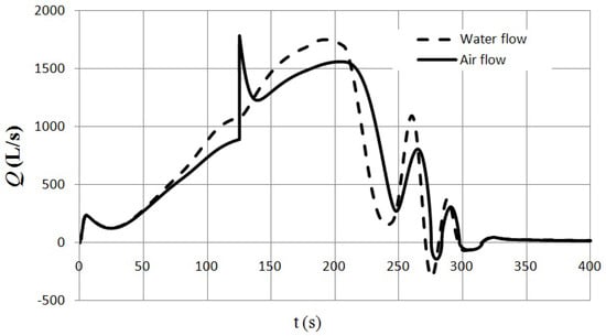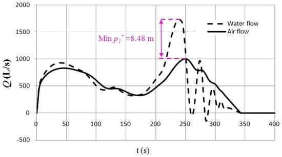 Figure 8 shows the behaviour of the water and air flow in the emptying column 2. At the beginning of the hydraulic event (from 0 s to 54 s), air valve 2 can introduce enough quantity of air volume adequately, where the water and air flow are similar with values of L/s and L/s, respectively. Then, from 54 s to 125 s, the water flow surpasses the air flow. The minimum value of m of sub-atmospheric pressure head is reached at 125 s, when air valve 3 starts to relieve the sub-amospheric pressure occurrence avoiding the risk of collapse of the installation at least until s. At s, air valves 2 and 3 cannot admit the required air volume generating another trough of sub-atmospheric pressure of m. At the end, some oscillations occur similarly to emptying column 1.