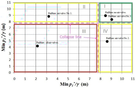 Figure 9 presents the minimum values of sub-atmospheric pressure depending on the failure of air valves 1, 2, or 3. Four zones are identified. Zone I is presented when both the air valves are working or air valve No. 3 fails. Then, the hydraulic system is completely protected from the sub-atmospheric pressure occurrence and there is no risk of collapse. Zones and are characterized for the failure of the air valves located at the ends. If air valve No. 1 fails, then air pocket 1 can cause the collapse of branch pipe 1 with a value of sub-atmospheric pressure head of m; and if air valve No. 2 fails, then the minimum value of the sub-atmospheric pressure head is m in branch pipe 2. The most critical condition is presented in Zone , when the air valves fail. Branch pipes 1 and 2 can collapse with values of sub-atmospheric pressure head of m and m, respectively. Good maintenance of air valves is crucial in order to minimize risk of collapse of pipelines during the emptying process.