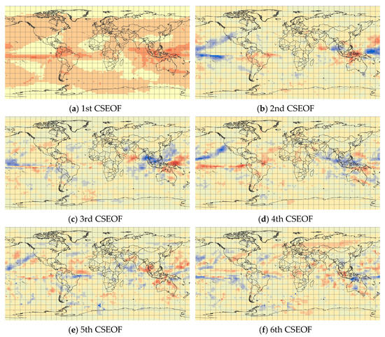 In contrast to EOF analysis, cyclostationary empirical orthogonal function (CSEOF) analysis is used to extract the major principle components, to explain the spatial variability of the raw data while considering the cyclostationarity. Cyclic behavior occurs in various climatological and hydrological data, among which the seasonal data and the global data are typical [47,48,49,50]. CSEOF analysis was introduced by Kim and North [20], and many application examples can be found in the field of meteorology [26,27,28,30,35,51,52,53] and oceanography [54,55,56,57].
