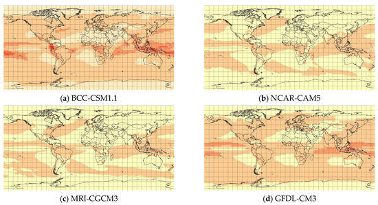 As can be found in Table 2, for the global data, the NRMSE of the IPSL-CM5A-LR model was estimated to be the smallest (0.03), followed by the NorESM1-M model (0.04) and the BCC-CSM model (0.06). For the zonal data, the BCC-CSM model was found to have the smallest NRMSE (0.19), followed by the IPSL-CM5A-LR model (0.20) and the NorESM1-M model (0.21). Finally, for the grid data, the IPSL-CM5A-LR model showed the smallest NRMSE (0.60), followed by the BCC-CSM (0.63), NorESM1-M (0.63), EC-EARTH (0.63), and FGOAL-g2 (0.63) models. Based on these results, it could be concluded that GCMs like IPSL-CM5A-LR, NorESM1-M, and BCC-CSM showed higher similarity to the GPCP data than the other GCMs.