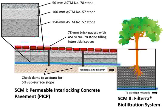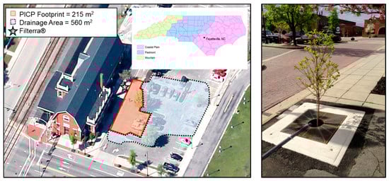 Four parking stalls and a drive lane were retrofitted with 215 m2 of Eagle Bay Aqua-Bric Type 4 L permeable interlocking concrete pavers to treat runoff from 560 m2 of existing asphalt surfacing (2.6:1 ratio of impervious area to PICP area). The underdrain of the PICP conveyed runoff to a 1.2-m by 1.2-m (plan view area) Filterra® device (Figure 2). Design of the PICP followed typical hydrologic and structural standards for permeable pavement in North Carolina []. The PICP profile consisted of 150 mm of washed ASTM No. 2 aggregate sub-base (nominal size 37.5 to 63 mm), 100 mm of washed ASTM No. 57 aggregate overlying the sub-base (nominal size 4.75 to 25.0 mm), 50 mm of ASTM No. 78 aggregate (nominal size 2.36 to 12.5 mm), and 78 mm-thick concrete brick pavers with No. 78 stone filling their joints []. Because the existing subgrade slope was relatively high (5%), two concrete check dams were installed to reduce the slope at the subgrade–aggregate interface to 0.5% [].