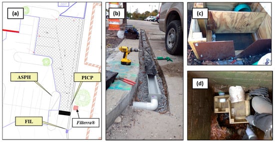 From left to right: (a) monitoring scheme for PICP-FIL system; (b) slot drain to measure runoff from parking lot (ASPH); (c) PICP underdrain measured with 30° sharp-crested v-notch weir (PICP); (d) catch basin where effluent from the Filterra® device was measured (FIL).