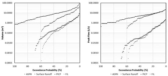 Exceedance probabilities for volumes (left) and peak flows (right) including surface runoff.