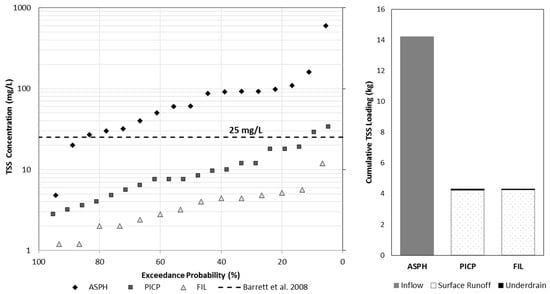 Filtration provided by the PICP and Filterra® significantly removed TSS (Table 12). Despite a large variation in influent sediment concentration (TSS: 4.8–600 mg/L), 87% of PICP effluent TSS concentrations were below the 25 mg/L target established by Barrett et al. [] (Figure 5). The median PICP concentration (8.4 mg/L) was comparable to or less than effluent concentrations from other permeable pavement studies (6.5–9.2 mg/L []; 6 mg/L []; 8.3 mg/L []; 39 mg/L []). Secondary treatment by the Filterra® provided a supplementary TSS EMC reduction of 47% and increased the proportion of effluent concentrations below 25 mg/L to 100%. By filtering particles through its engineered media, the function of the Filterra® for sediment removal is similar to bioretention. The median effluent concentration from the Filterra® (3.6 mg/L) was lower than values reported in bioretention literature (13–20 mg/L []), but was similar to a standalone Filterra® monitored at the same parking lot (median: 4 mg/L []). This suggests that, regardless of pre-treatment or influent concentrations, effluent TSS concentrations from a Filterra® system will likely be similar and very low.