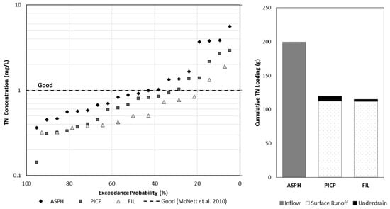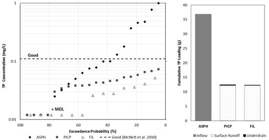 Influent TP concentrations were generally less than those reported from North Carolina asphalt parking lots (mean TP concentration: 0.19 mg/L []). As a result, effluent TP concentrations from both the PICP and Filterra® never exceeded the “good” water quality concentration threshold (0.11 mg/L) for the piedmont region of North Carolina as described in McNett et al. [] (Figure 6). A majority of the phosphorus was sediment-bound and thus easily filtered by the PICP and Filterra® (Table 11 and Table 12). The Filterra® media is marketed as phosphorus adsorbent; while definitive comparisons could not be made due to low concentrations, it is possible the media facilitated additional TDP removal. Secondary treatment by the Filterra® significantly (and substantially) lowered TP concentrations, improving the median removal efficiency from 41% (PICP treatment only, = 0.039 mg/L) to 75% (overall PICP-FIL treatment, = 0.029 mg/L). While TP concentrations entering the Filterra® were already low, additional filtering and sorption by the engineered media further reduced concentrations below those reported in bioretention literature (0.058–0.56 mg/L []). Effluent concentrations from the PICP-FIL system were also lower than those measured from the standalone Filterra® on the same site ( = 0.038 mg/L []); adding the Filterra® downstream of the PICP clearly improved TP concentration reduction.