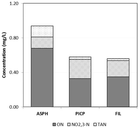Primary treatment by the PICP reduced TN to a target concentration (0.99 mg/L []) 70% of the time (Figure 7). Secondary treatment by the Filterra® increased the probability of meeting this target to more than 85%. The median RE for the PICP and PICP-FIL system was 27% and 42%, respectively; secondary treatment by the Filterra® was not significant for TN or any nitrogen species (Table 12). The median concentration of the PICP effluent (0.68 mg/L) was comparable to effluent concentrations from other permeable pavement studies (e.g., 0.80–1.1 mg/L []; 0.83–1.28 mg/L []; 0.58–1.06 mg/L []; 0.58 mg/L []). TN reduction through the PICP was primarily due to filtration and sedimentation of particulate-bound organic nitrogen (ON) (ON = TKN − TAN), which accounted for 70% of the composition of nitrogen measured from the asphalt parking lot (Figure 8). Median concentrations of NO2,3–N increased during “treatment” by the PICP due to the introduction of NO3− via the nitrification of NH4+ (Table 11, Figure 8), which has been well-documented in other permeable pavement field studies [,,,]. Denitrifying NO3− to N2 gas requires anaerobic conditions (typically created through a saturated zone) and the presence of organic carbon. Since the PICP neither had a mechanism to create anaerobic conditions nor an identifiable carbon source, concentrations of NO3− tended to increase in the PICP runoff and in some individual storm events, contributed to an overall increase in total nitrogen.