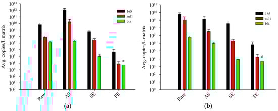 Concentrations of blaSHV/TEM, sul1, and bacterial 16S rDNA in different wastewater treatment matrices. (a) The solids-associated qPCR concentrations; (b) The dissolved fraction qPCR concentrations. Error bars represent one standard deviation from the mean. Bar colors indicate the following samples, black: bacterial 16S, red: sul1, green: blaSHV/TEM. The * symbol denotes matrices where all samples analyzed were below the LOD with the corresponding bar representing the detection limit for that particular gene. Raw: raw sewage, AS: activated sludge, SE: secondary effluent, FE: disinfected final effluent.