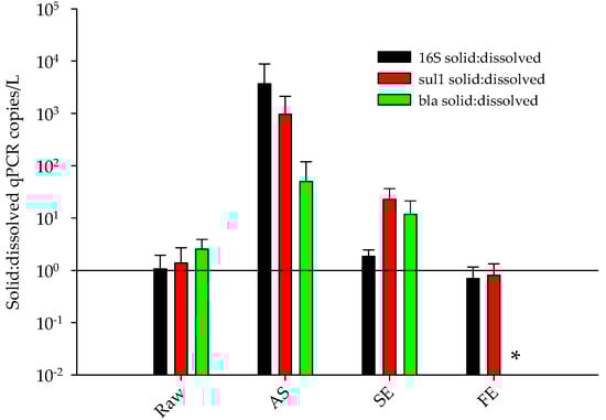 The proportion of ARGs observed in the solids and dissolved fractions during different wastewater treatment stages. The plot shows the ratio of solids to dissolved qPCR copies for total bacteria (black bars), sul1 (red bars) and blaSHV/TEM (green bars) in raw sewage (Raw), activated sludge (AS), secondary effluent (SE), and disinfected final effluent (FE). The bars represent the average of at least three separate samples with error bars indicating one standard deviation from the mean. The horizontal line is provided for reference and denotes equal ratios of solids and dissolved genes. The * symbol indicates that blaSHV/TEM concentrations in the final effluent were all below the LOD.