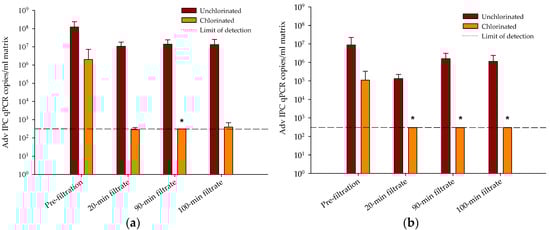 The removal of an antibiotic resistance plasmid by filtration and chlorination processes. An exogenous laboratory-modified plasmid was added into secondary effluent from a WRP and filtered through a dual-media pilot-scale filter with or without chlorine treatment. (a) dissolved fraction qPCR data (b) solids-associated fraction qPCR data. Pre-filtration refers to samples taken after addition of the plasmid but prior to filtration. The 20, 90 and 100 min. filtrate designations refer to effluent coming through the filter 20, 90 and 100 min. after the start of filtration. The data represent the average of at least seven independent filtration experiments. The maroon bars represent the unchlorinated samples and the orange bars represent the chlorine treated samples, the dashed line represents the limit of detection for the assay. Error bars represent one standard deviation from the mean. The * symbol indicates that all replicate samples were below the LOD of the assay with the corresponding bar representing the detection limit value.