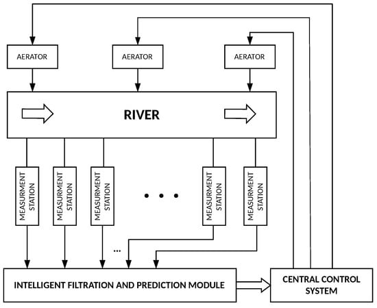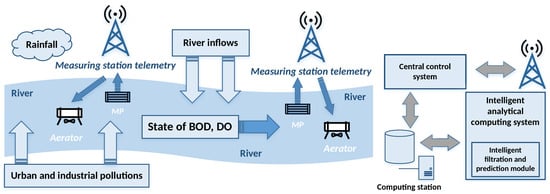 Contaminated water, partially or completely polluted as a result of household, industrial, agricultural and other uses is commonly referred to as waste water. The largest part of the pollution in waste water contains detergents, organic matters and oils. There are different approaches for removing these contaminants or eliminating them. We can divide them into two groups of methods: artificial or natural. The first method uses a set of filters: mechanic filters (for precipitation, flocculation, trapping pollutants by organisms and by hyporheic sediment, sorption on mineral and organic particles), chemical filters (for chemical degradation of pollutant, as abiotic oxidation and photo-oxidation) and biochemical filters (biodegradation of pollutants, assimilation). The second method, also referred to as self-purification, is a natural process of rivers, lakes or canals to recover the rate of dissolved oxygen values of the highest concentration of oxygen, which is one of the best indicators of water quality. The self-purification process of water bodies are processes involving biological, chemical and physical processes working simultaneously on biological pollutants, oxidizing them and increasing the amount of dissolved oxygen. Self-purification of running waters is a set of natural processes that are present in rivers and streams, enhanced by water turbulence that helps to increase the amount of oxygen to dissolve in the water. The self-purification aspect and its control provide the leading motive of this paper [1,2,3,4]. A problem of paramount importance to contemporary societies is determining how to best retain the quality of stream water and maintain acceptable levels of dissolved oxygen concentrations using a variety of pollution control activities. For the prediction of dissolved oxygen in a stream under scenarios of interest, different heuristic and deterministic models have been applied in the past [5,6]. Neural networks are a proven and effective tool for diagnosing and controlling difficult-to-measure processes where precise parametrization of a mathematical model is difficult or even impossible [7,8]. In recent years, ANN have found a number of applications in the area of water quality modeling. A good review of the applications of ANNs in water quality modeling was summarized by the American Society of Civil Engineering (ASCE) task committee on the application of Artificial Neural Networks in hydrology, ASCE [9]. Recently, several methods involving intelligent soft computing techniques have been proposed [10,11]. Taormina et al. proposed in [12] data-driven base-flow separation-based modular models for the prediction of stream-flow discharge. Wu et al. proposed in [13] the use of a modular artificial neural network for improving rainfall prediction. In addition, the advantages of techniques with particle swarm optimizations for downstream river flow forecasting have been proposed in [14]. Daily rainfall prediction has been modeled with a hybrid model integrating artificial neural networks and support vector regression [15]. Based on the authors’ collective knowledge and previous experience in mathematical modeling of a river object [8,16,17,18,19,20,21] and preliminary concepts presented in [22], we propose in the paper a novel intelligent system that monitors and controls the quality of water in a river using ANN (Figure 1). The conceptual diagram represents a river fragment and its banks, along which are placed telemetry stations, sampling points Measurement Point (MP) and devices for aeration of monitored river sections.