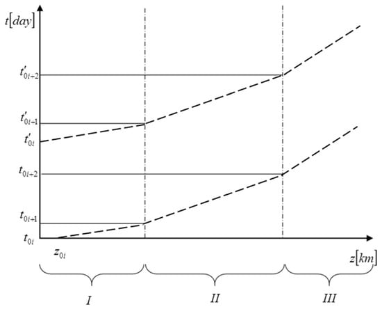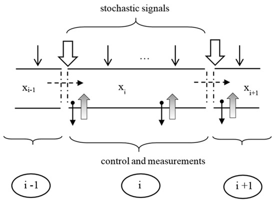 in which is the initial coordinate in the moment . For the same characteristic, the moment , determines the starting point in i+1-st segment. A set of line segments of the characteristic covers the space-time field, to which further considerations regarding the issues of river state estimation [20,32,33,34,35] will be related. Measurements continuous in time can be performed at specified control points along the river. The considerations concern a boat drifting freely with the river current. Shifting down a particular river, encountering the located control points, the measurements taken for a given characteristic become discrete in time. Continuous measurements are described with the equation [33,34]: