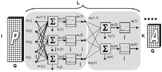 Artificial neural networks are already well established as a proven data analysis tool. In this section, we briefly review supervised feed-forward neural network with the back-propagation learning strategy. Figure 4 presents the exemplary two-layer ANN regarding typical Matlab (R2013a (8.1.0.604), MathWorks, Natick, MA 01760-2098, United States) environment notation of the input pattern P and output activations A ,respectively.