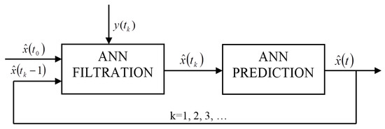 where —estimate in moment obtained based on the measurements , —estimate covariance error, and —enhancement filter coordinate. The prediction is based on finding an estimate prior to the next measurement moment for , taking the estimates obtained in the filtration process for the initial values. The prediction is presented with the equations: