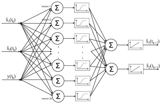 The value of estimates from the previous moment and the value of measurement were given at the system input. In the ANN training process, we trained both network modules with the target values of estimates obtained from the mathematical model. The execution of filtration process is the first stage. The output signal of this part of the system are the estimates values in discrete measurement moments which are the input signals for the second ANN structure in the prediction process. As a result, the estimate values of BOD and DO are obtained, which are given with the feedback loop at the system input. The structure of neural network for the filtration (see Figure 7) stems from the logic of functioning of this process. The BOD and DO state estimate is obtained at the output in discrete measurement moments. The input signals are the state estimates determined before the measurement moments and the measurement signal. Thus, in the input layer, there are three receptors (two state vector coordinates and measurement), and the output layer comprises two neurons that generate estimates in measurement moments.
