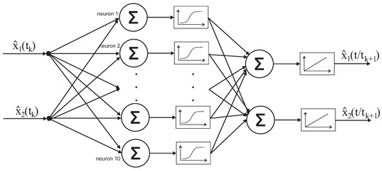 The amount of neurons in the hidden layer and the selection of activation function are the result of experimental studies. The activation function in the hidden layer is sigmoid, and linear in the output layer, in order not to restrict the values of output signals obtained from the network. It is worth mentioning that such network architecture represents one characteristic for one execution of the filtration process. In order to obtain state estimates for multiple characteristics, it is necessary at the network input to give the current measurement and corresponding estimates values connected with a particular characteristic. The prediction process runs interchangeably with the filtration process and executes a task, which is to obtain BOD and DO estimate values obtained in the filtration process. In the river control system [42], this process must closely cooperate with the filtration and deliver information concerning the river condition between conducted measurements. The network architecture is similar to the filtration process, while in the input and output layer, there are only two neurons, and the amount of neurons in the hidden layer can have different values. In the prediction in the hidden layer a sigmoid activation function was used, and linear one was used in the output layer [22,32,34]. During the training of networks, different BOD and DO state values can be used. The neural network diagram in the prediction process is presented in Figure 8.