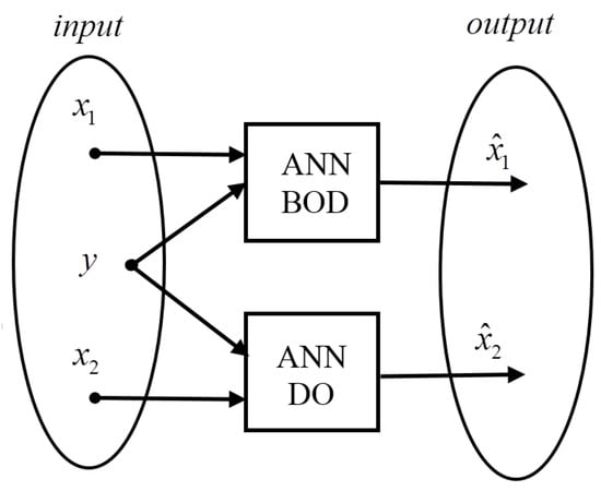 The purpose of the system is to monitor the quality of water, and, in the event of threats to its lifeforms, respond accordingly by reducing the effects of emerging pollutants. Its primary function is to predict the state of water quality in real time because of the ravages occurring when delayed response to impurities leads to irreversible ecological changes in the river. The monitoring system based on DO measurements and BOD estimation performed by neural networks is able to determine the current values of river pollution indicators. The system also predicts their changes over an assumed time interval. Using this information system generates appropriate controls for water aeration devices in the river. This is a key mechanism to safeguard the life forms of the river and the water quality. Using the Kalman–Bucy filter in the state estimation process requires knowledge of the characteristic features of extortion processes such as disturbances effecting the system and measurements. It usually involves great amounts of work and does not always lead to satisfactory results. Using artificial neural networks is an alternative solution, which will support the execution of filtration process thanks to its properties [8,17,38,39,40,41]. The studies employed feed-forward artificial neural networks and training based on backpropagation algorithm. Taking into consideration the complexity of questions that result from the measurement comparison of discrete and continuous objects, it is difficult to find one structure of neural network that would generate estimates with satisfactory results. This is the reason why two separate structures of artificial neural networks were used, as in the case of the filtration and prediction process Figure 6. Obviously, these networks cooperate with one another according to the algorithm of estimation that uses the filtration and prediction processes [4,21,22,32,34].