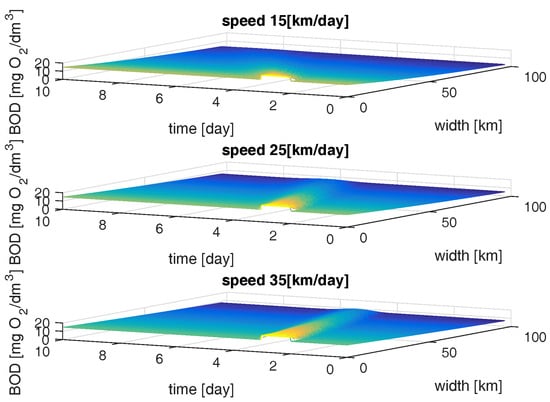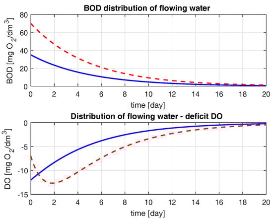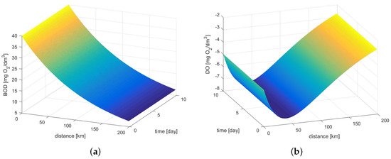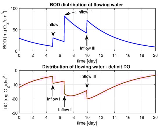 Using a river model based on the Streeter–Phelps equations, the kinetics of changes in biochemical oxygen demand and dissolved oxygen deficit has been described. The experimentations for the river described by Equations (1) and (4) has been performed according to the method described in Section 2.2. We consider the contamination state of freely flowing water, which is described by the vector . Rivers have the ability to self-clean, i.e., as pollutants increase, the values of BOD and DO decrease with the passage of time. The existence of a large deficit of dissolved oxygen at high BOD values is a natural phenomenon, which in the case of high oxygen demand generates an increase in the DO deficit. During the simulation experiments, among others, two emergency states were adopted that could occur under real conditions (see Table 1). It was assumed that a system that responds appropriately to such critical initial conditions will function properly in the real conditions of the standard levels of pollutions in the river. It was noticed that BOD had a significant influence on DO. An interesting phenomenon can be observed when inflowing pollutants have a value several times greater in mg/L. As a result, the greatest oxygen deficit (the most dangerous conditions for living organisms) can be observed after a few days and a several dozen kilometers away from the pollution inflow (see broken red line, Figure 11).