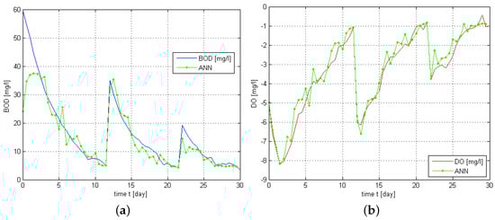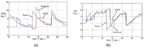 Estimation of BOD (a) and DO (b) obtained from Kalman’s filter and ANN.
