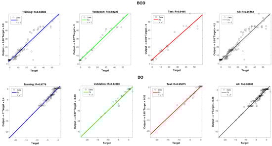 R values for the training, validation, testing and all data for BOD and DO indexes, respectively.