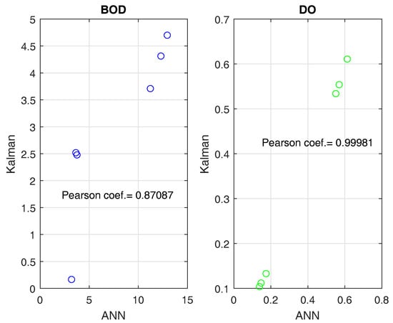 The obtained results, shown in the table above, encompasses quality coefficient values for six different configurations of the river model. The results confirm that artificial neural network gives more precise estimates of river state than classical Kalman’s filter. The quality indicators of BOD are greater because there is no information from measurements about that pollution indicator. Common analysis of Pearson coefficient (see Figure 19) and J indicator allows the assessment of the quality of the methods used. For DO, the Pearson index has values closer to 1, which implies that both methods achieved a similar performance level. On the other hand, for BOD, the lower values of the J (see Table 4) indicator and the Pearson coefficient clearly indicate the higher efficiency of ANN in relation to the Kalman filter in the estimation process.
