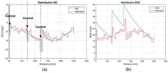 BOD distribution and estimate (a); DO including the control from DO (b).