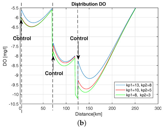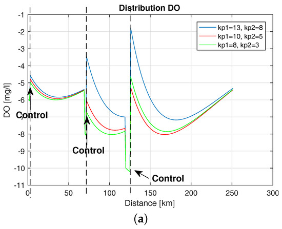 Introducing the control based on BOD and DO caused the system to react sufficiently early, which prevented the development of unfavorable conditions in the river and allowed the maintenance of DO values close to the assumed level. The experiments were carried out regarding various initial conditions for BOD and DO values and the influence of enhancement coefficients . Figure 21 shows the distribution of DO deficit with control for different values of i for initial conditions BOD = 30 (mg/L) and DO = −6 (mg/L). The control occurred in three places due to the occurrence of undesirable biological conditions in the river. Here, we see a significant influence of the value of the gain factor of the regulator. Small amplification values cause a lesser response to the change in DO during the control, leading to increased occurrence of hazardous conditions in the river.
