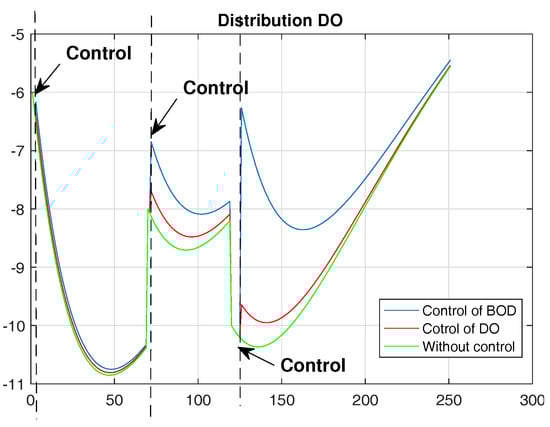where , , —are, respectively, n and m dimensional vectors of state and control. Matrices , are assumed as constants, . River pollution levels control [25,50] is performed by introducing a particular amount of oxygen directly into the body of water. In order to select a type of control, the information specific to the current real river condition is required; then, the control will be more accurate. DO measurements can be obtained in a quick and easy way, but the obtaining of BOD value indicator is toilsome and requires laboratory conditions (BOD or BOD), where the indicator index presents the number of days necessary to obtain credible results concerning the water polluted with organic compounds. This is why BOD values are estimated in the estimation process. For the actual considerations concerning the polluted river, we seek the controls described with the dependency: