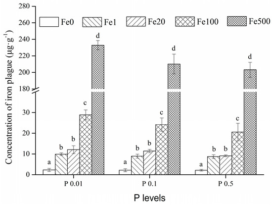 The amount of iron plaque on roots surface of G. spiculosa grown hydroponically with varying Fe2+ concentrations and P levels. Values (mean ± SE, n = 3) followed by different letters designate significant differences (p < 0.05) between Fe2+ concentrations for a given P level (a, b, c, d). The data were square root transformed before statistical analysis.