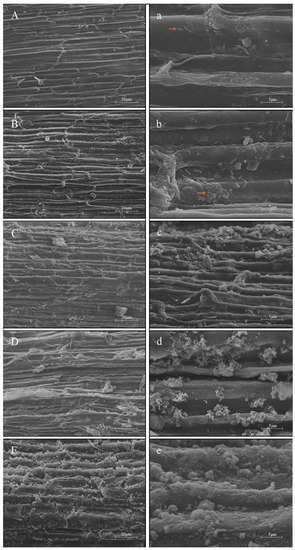 The morphological analysis of roots by SEM showed that iron plaque clearly visible as an orange-brown deposition on the root surfaces. Figure 2A showed the root surface of Fe 0 treatment, which was the lowest deposition with plaque. The coating was extensively distributed across the root surface and consistently increased with increasing Fe2+ (Figure 2B–E,b–e). Microorganisms were also observed on the root surfaces of G. spiculosa, such as Figure 2a,b.